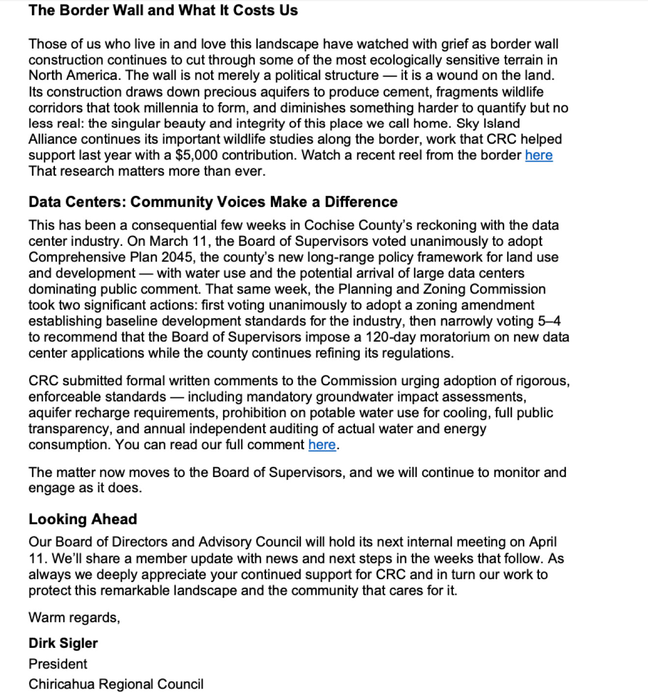 The Council is a citizens’ watchdog group that monitors public agency actions and other issues affecting the Chiricahua, Peloncillo and Dragoon Mountains and nearby areas of southeastern Arizona, southwestern New Mexico, and adjacent northern Mexico.