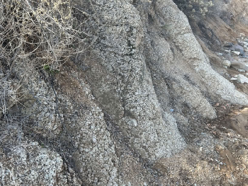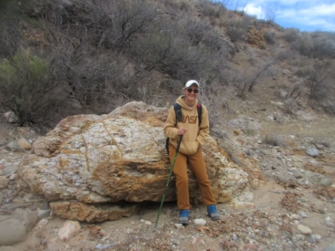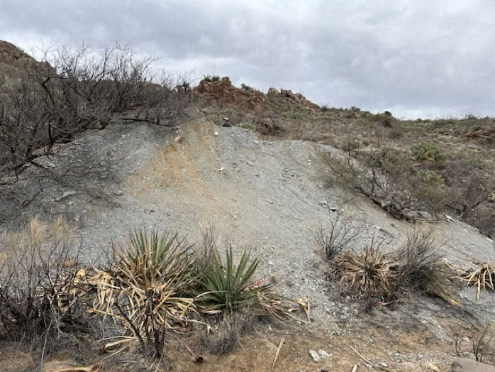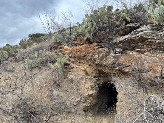 Retracing our steps and heading downstream we stopped at an old mine and some of us walked a short way into the shaft, carefully and with flashlights, of course. You can see the mine site by looking for the extensive tailings on the right as you walk up the wash. The Chiricahua Mountains are riddled with old mine shafts. Mining here focused primarily on silver, copper, lead, zinc and gold. The area saw varied success, with the Hilltop Mine being the largest, notable for producing wulfenite crystals.