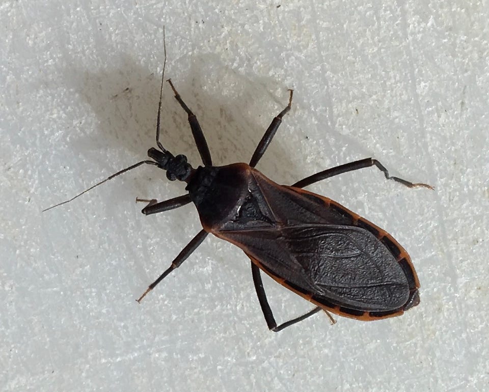 Carol did a wash two days ago and piled my clean clothes on the dresser near our bed. After a jog an hour ago, I showered and attempted to dress. As I was putting on a clean pair of underwear from the pile, this kissing bug fell from inside the shorts to the floor. This is shaping up to be a bad year for kissing bugs. Maybe we'll have dinner tonight inside our bed net!