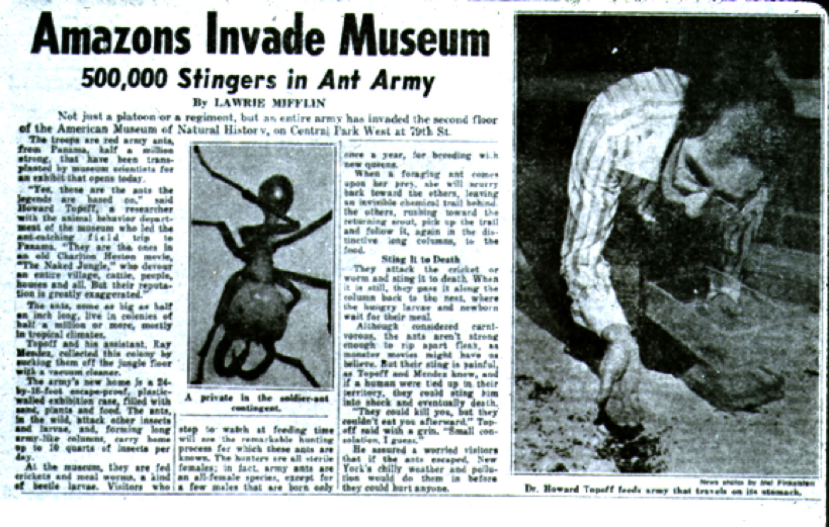 Mr. Topoff, who studied at the museum under the late T. C. Schneirla, a pioneer in army ant research, devised the method of a household vacuum cleaner powered by a generator as the easiest method for scooping up colony of army ants. The ants were filtered into porous bags, put in crates and then, with the approval of the Department of Agriculture, flown from Panama to New York.