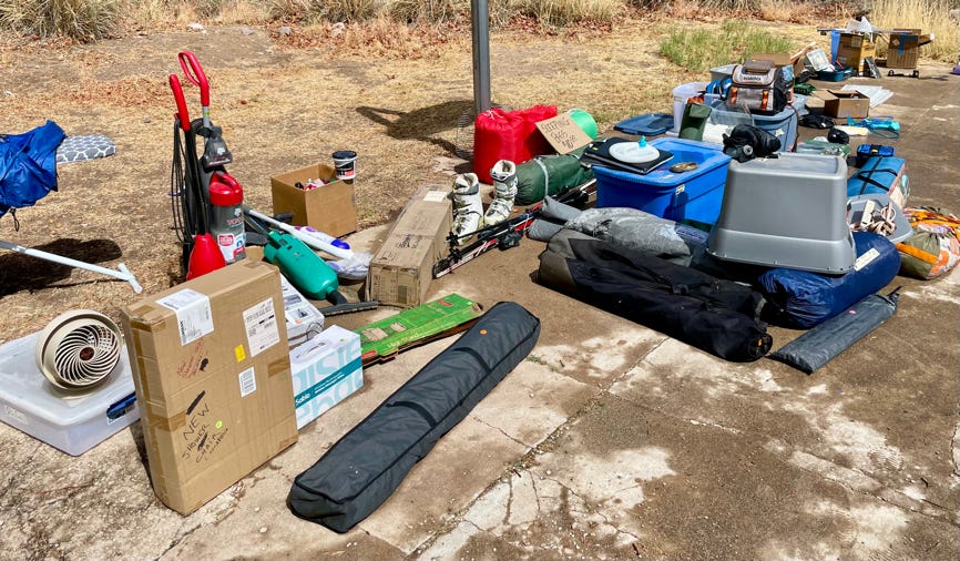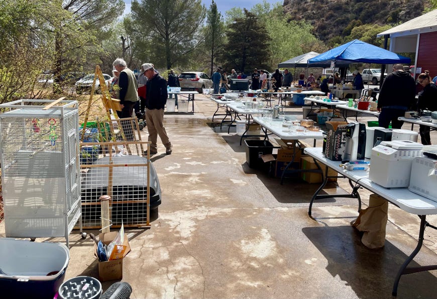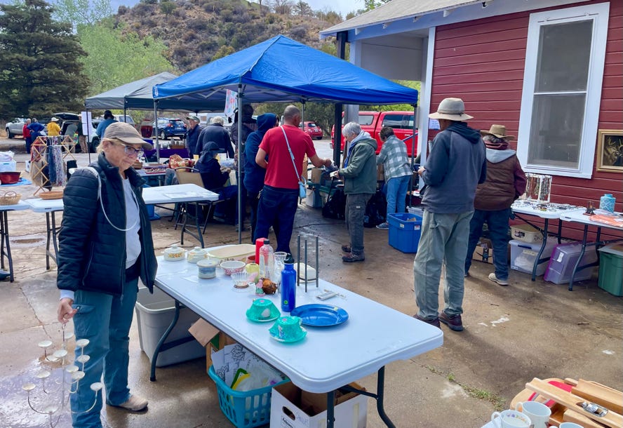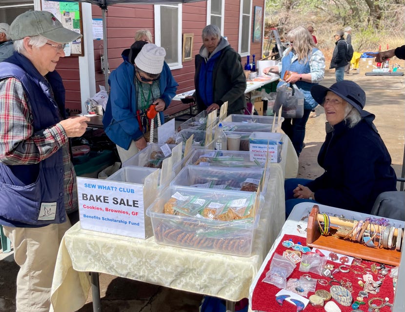 On Saturday morning, April 19 it rained. Not enough to reach the roots of any plants, but perhaps enough to put a damper on (or even ruin) the annual Sew What Rummage Sale. But, as is common these days, the total rain was about 0.03 inches, the drizzle lasted about 30 minutes and the Rummage Sale was a huge success. See anything you like? See anything you purchased?