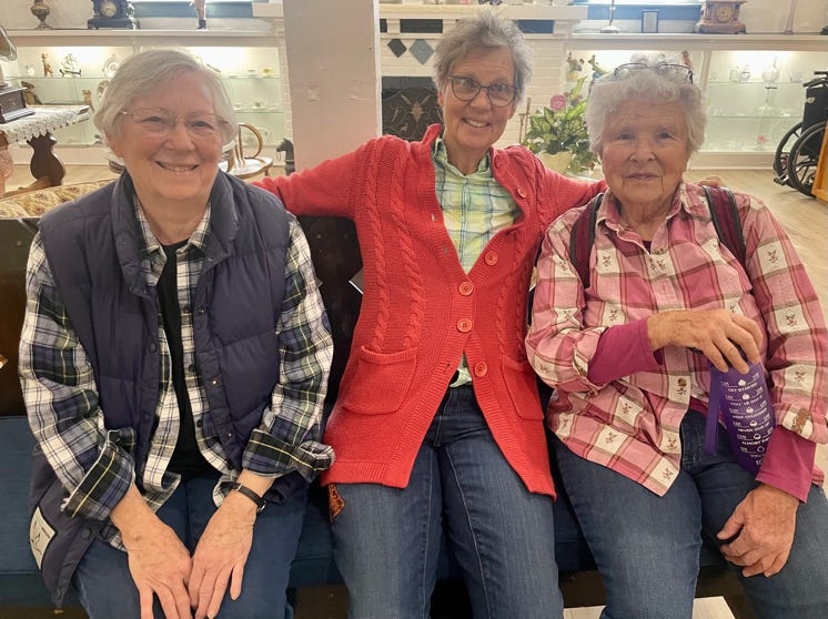 Mary Carson had a flat on her pick-up. While she read from the manual how to find the hidden spare tire and disengage it from under the truck bed, Mary Winkler got out the jack handle and followed the instructions . Since Mary and Kari Chalker had on pants, they slid under the chassis and positioned the jack. Up came the pick-up, the flat tire was removed and the spare slipped on. Down came the pick-up. The lug nuts were tightened. The flat tire and jack were tossed in the back. Mary Carson drove away while Mary Winkler and Kari dusted themselves off. "It was just like a race car pit stop", said O'Leary Squier with a touch of awe.