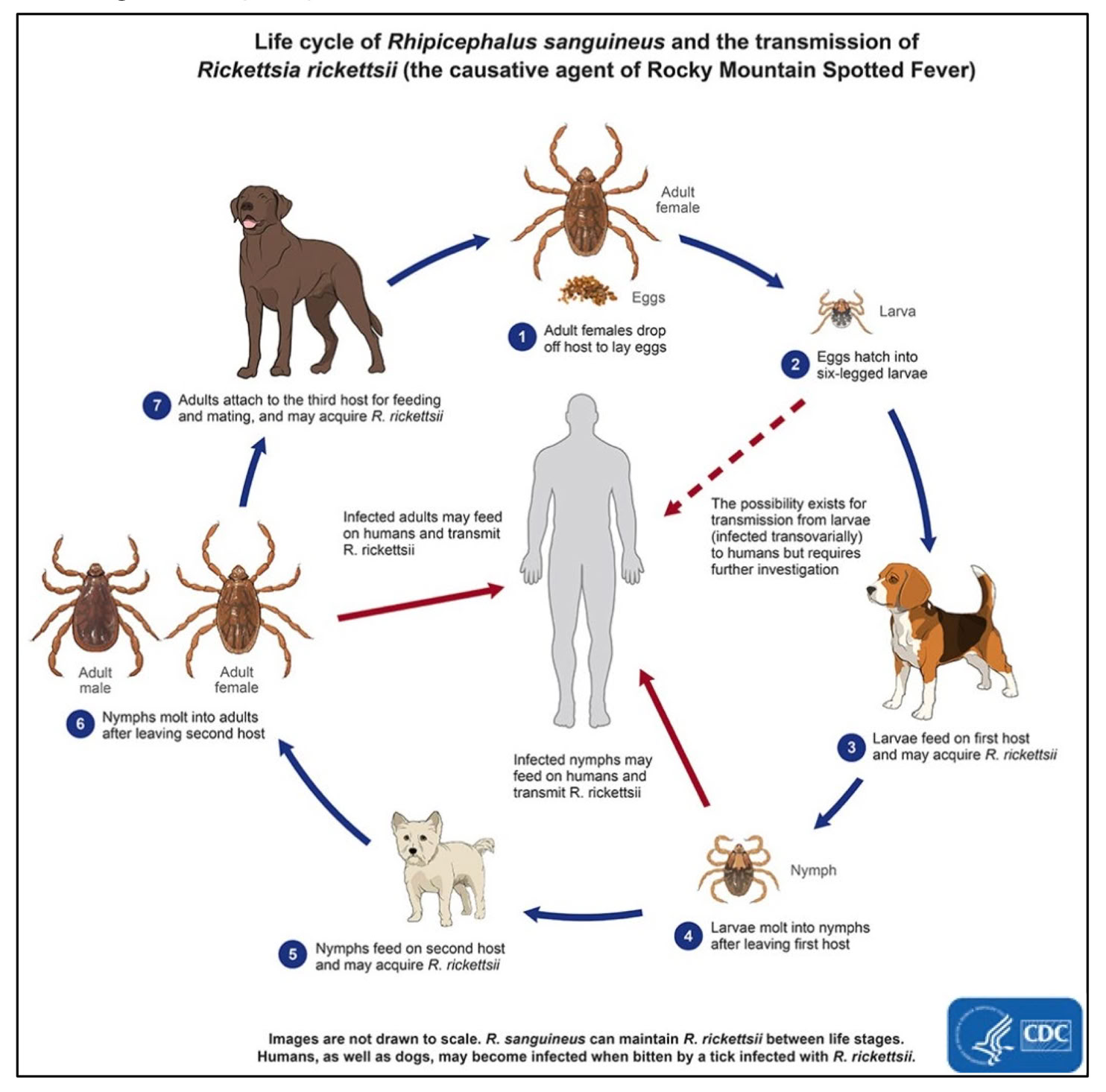 While human bites are rare, they do occur, especially in homes or kennels with infested dogs. The most serious risk is Rocky Mountain spotted fever (RMSF), caused by the bacterium Rickettsia rickettsii. Symptoms can include fever, headache, rash (often starting on wrists/ankles), muscle aches, and nausea. Without prompt antibiotic treatment, RMSF can be life-threatening. In Arizona, the Brown Dog Tick is the primary vector of RMSF