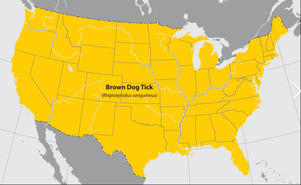 Where is this tick found? EVERYWHERE! It is one of the few ticks that can complete all life stages inside homes and survives in comparatively dry indoor settings by sheltering in microcracks and emerging to feed when conditions/hosts are favorable.