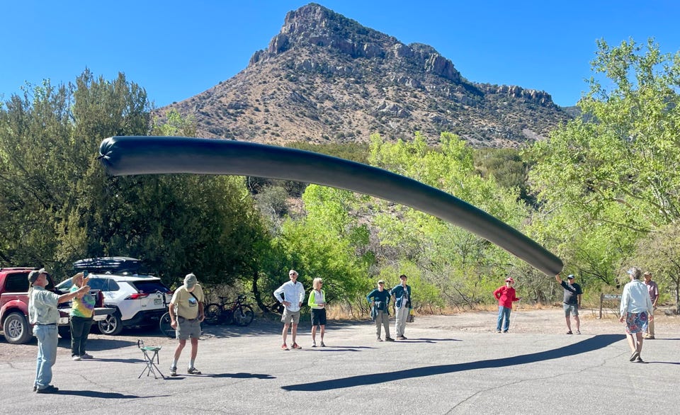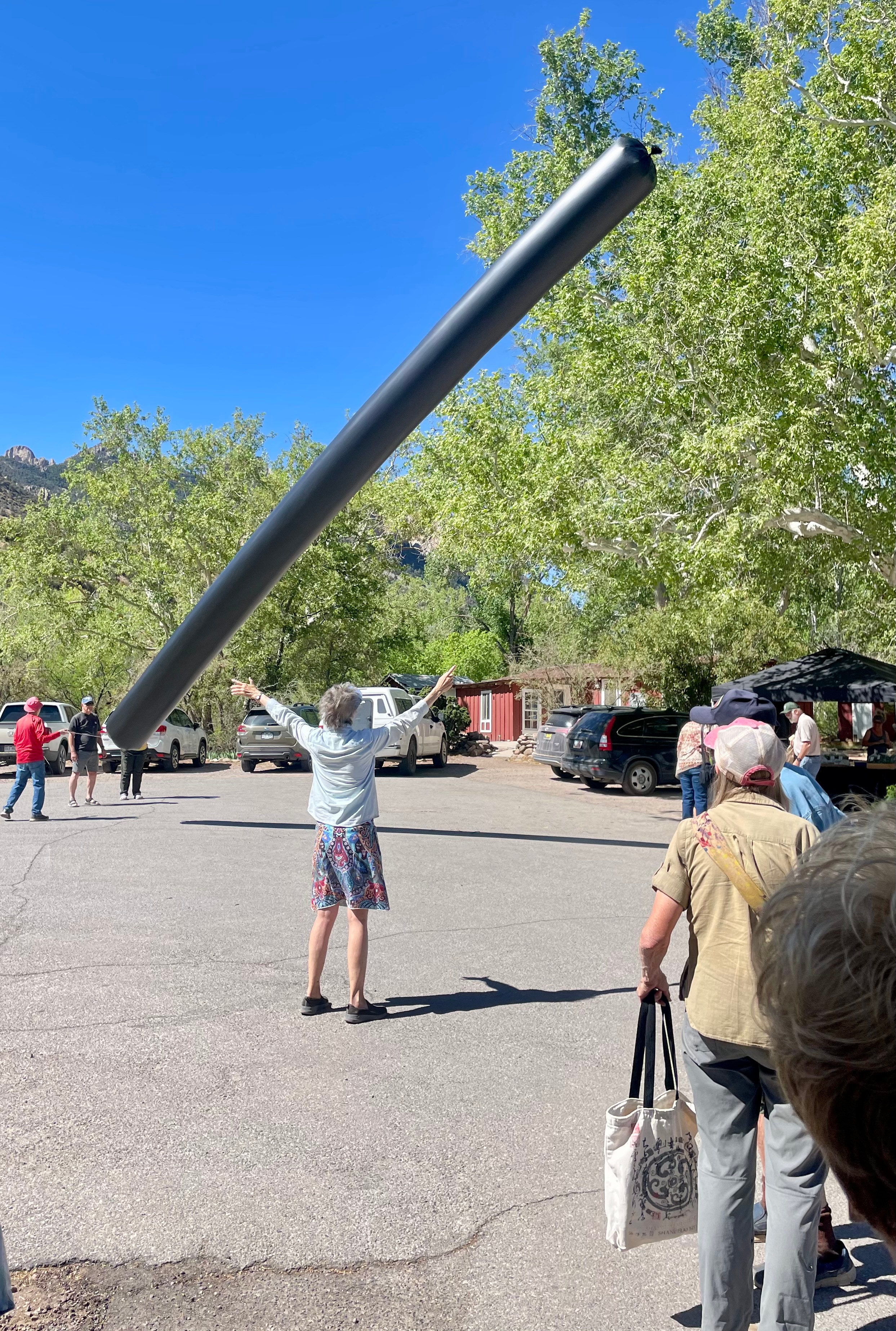 The science behind this event is the same as a hot air balloon. But instead of using a fire to heat the air inside the balloon, the black plastic skin absorbs sunlight and converts light into heat. The heated air inside is less dense than cooler air outside and the balloon rises. To keep the long object as light as possible, the plastic skin is paper thin. After about 20 minutes, one end blew against some branches of the sycamore tree and made about 5 tears in the balloon. That end was cut, the new end sealed and our 55-ft balloon became a 45-ft balloon. Still, it had enough lift to excite the people at the Farmers Market. One person tried to straddle it, but their 100+ pounds was a bit too much for liftoff.