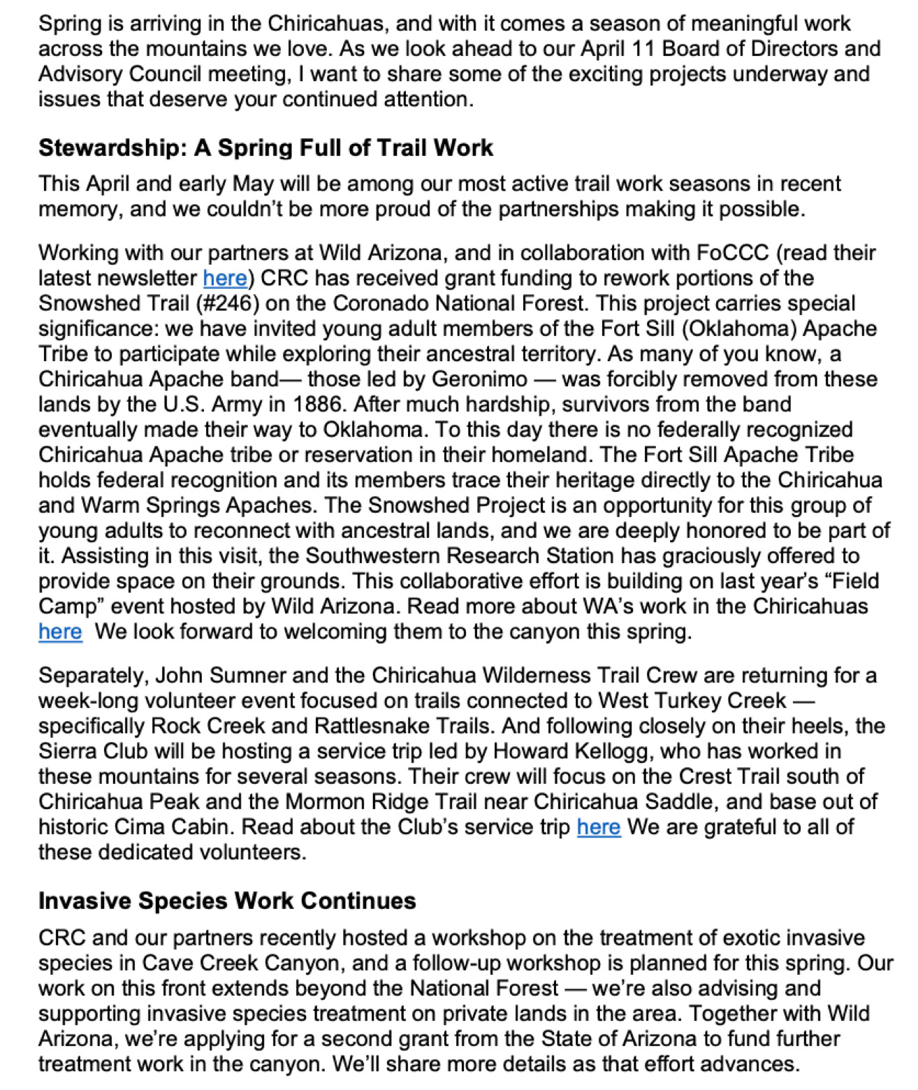 The Chiricahua Regional Council expresses profound concern over recent federal staffing reductions threatening our vital trail maintenance partnerships. Nationwide 3,400 workers have been abruptly fired. This represents 10% of US Forest Service personnel and the disturbing part is that the firings are disproportionately affecting Recreation staff. A troubling feature of the current Washington administration’s assault on the Forest Service is an instruction to staff that they may not even communicate with their partners. In other words a gag order.