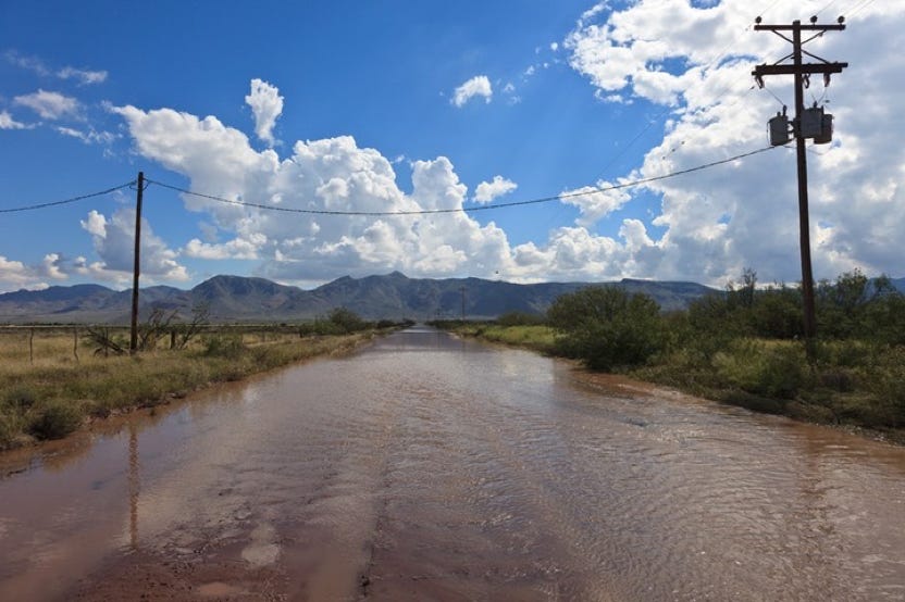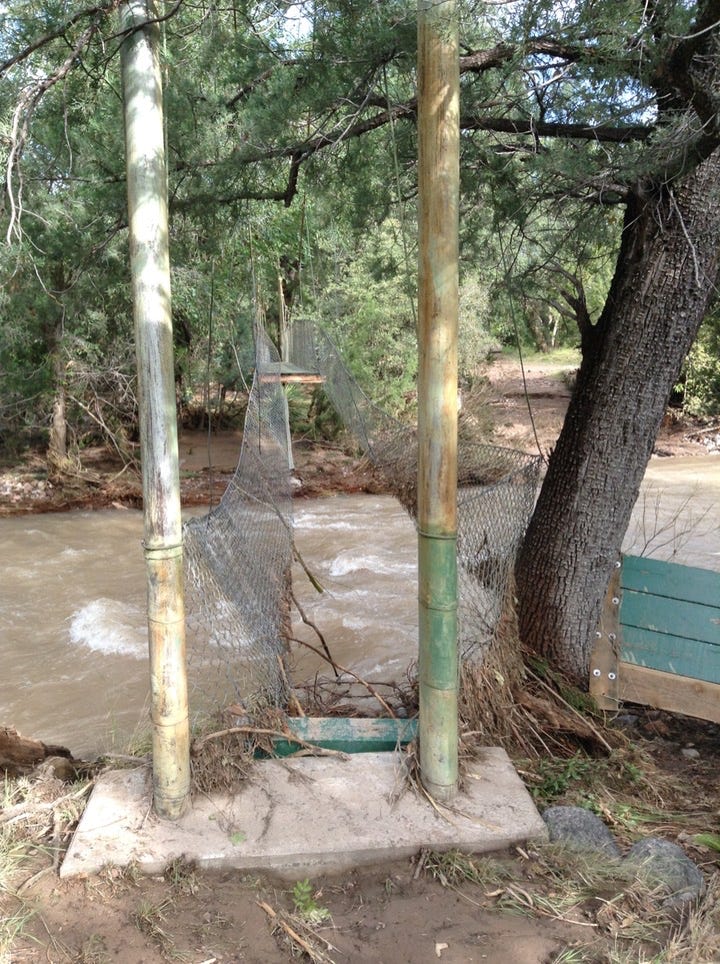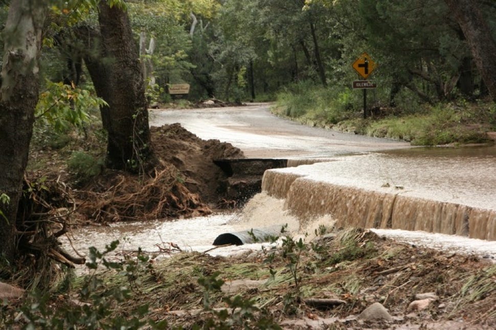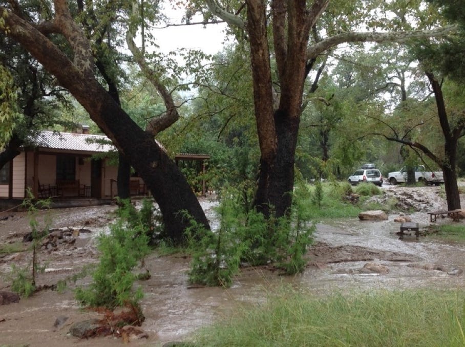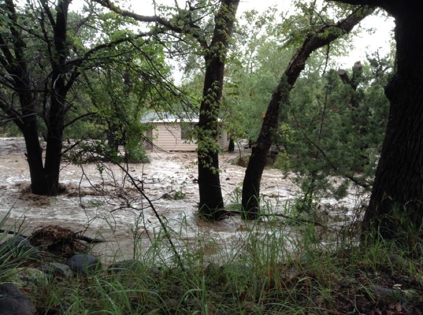 The Forest Service is calling it the 500-Year Flood. Others are comparing it to Katrina, Johnstown Pennsylvania, and Noah. Whatever - we had water where no one living here today remembers water! New creeks popped up everywhere. On September 17, twostorms fromBaja created a deluge the likes of which we have never seen. Fortunately, as far as I know, only the creek-side cottages of Cave Creek Ranch had serious indoor flooding. There are reports that some of the straw bales in Morgan & Johns’s new house were wet. This page will begin to tell the story in pictures, stories and even song (if someone sends me a song). But, as they say, you had to be here to believe it!