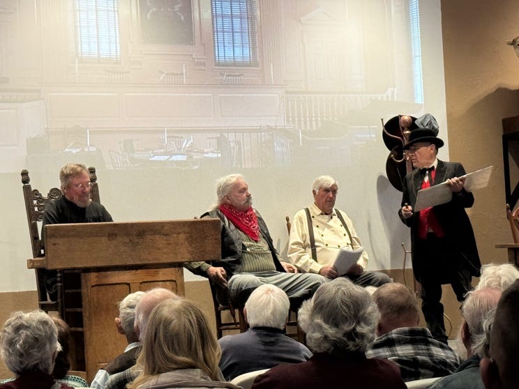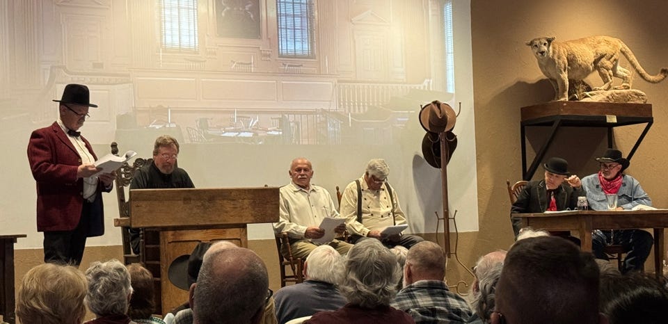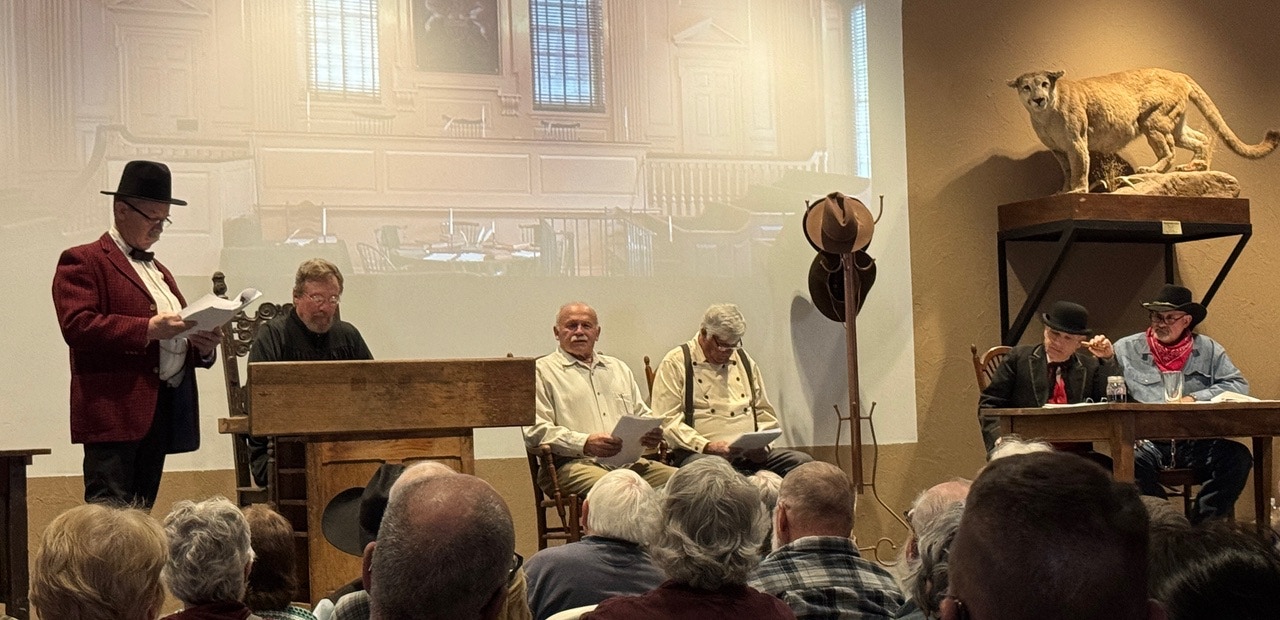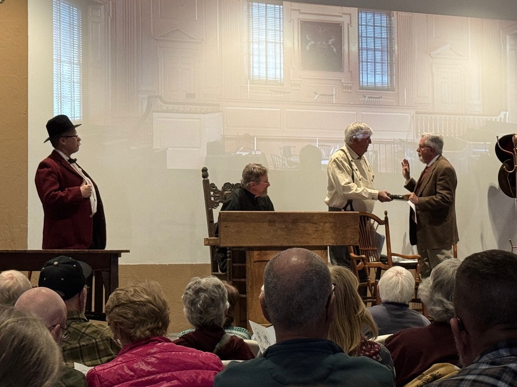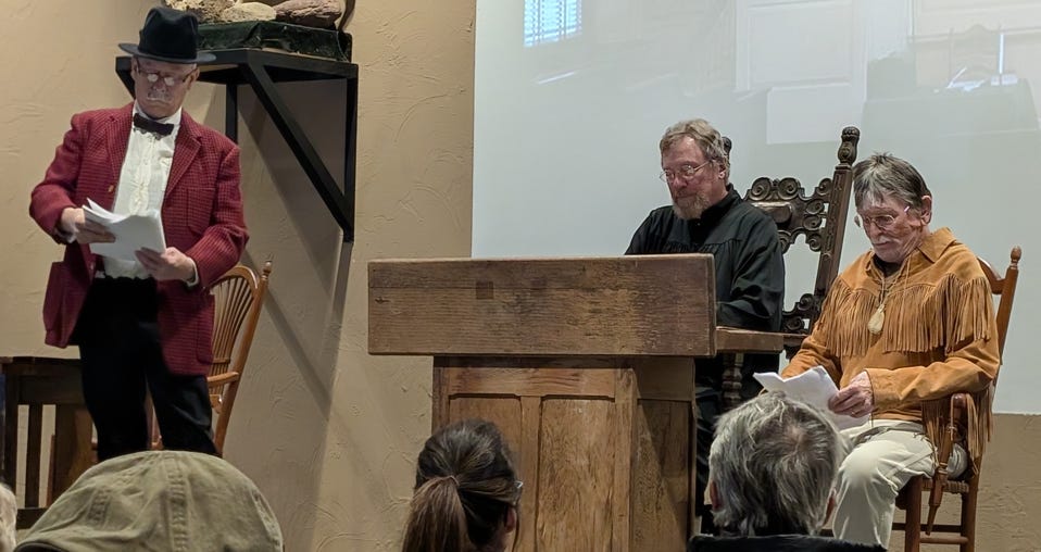 Ninety-three people showed up, for a live play performed at the Geronimo Events Center. It was written and directed by Dave Thomas. Some of the main roles were Judge Frank Parker portrayed by Dan Crow of Las Cruces, Prosecuting Attorney Thomas B. Catron portrayed by Craig McEwan, Defense Attorney Albert B. Fall played by Bill Cavaliere, Eva Taylor played by Karla Steen of Las Cruces, Oliver Lee portrayed by Sal Patricolo of Las Cruces, Albert Fountain Jr. played by Jesse Bradfield, Dr. Francis Crosson played by Ray Mendez, Thomas Brannigan portrayed by Edward La Russa, Antonio Garcia played by Bill Wilbur, Jack Maxwell played by Scott Huber, and Sheriff Pat Garrett portrayed by Bob Ashley.