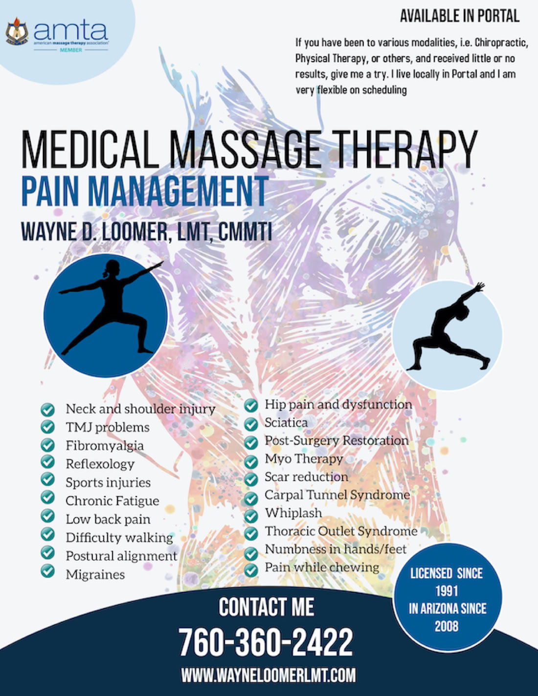 My name is Wayne Loomer. I am a massage therapist and have been here in Portal since February of 2020. I have been doing Medical Massage Therapy since 1991 and have had much success with various types of injuries and musculoskeletal problems.