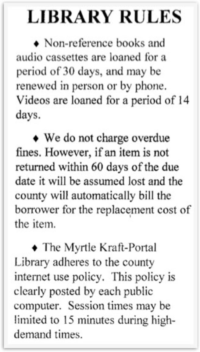 Did you know that the Friends of the Myrtle Kraft Library pays the monthly Columbus Electric bill for the post office, library and bookstore? Yup, your donations pay those bills, keeping all three buildings open and operating. **
