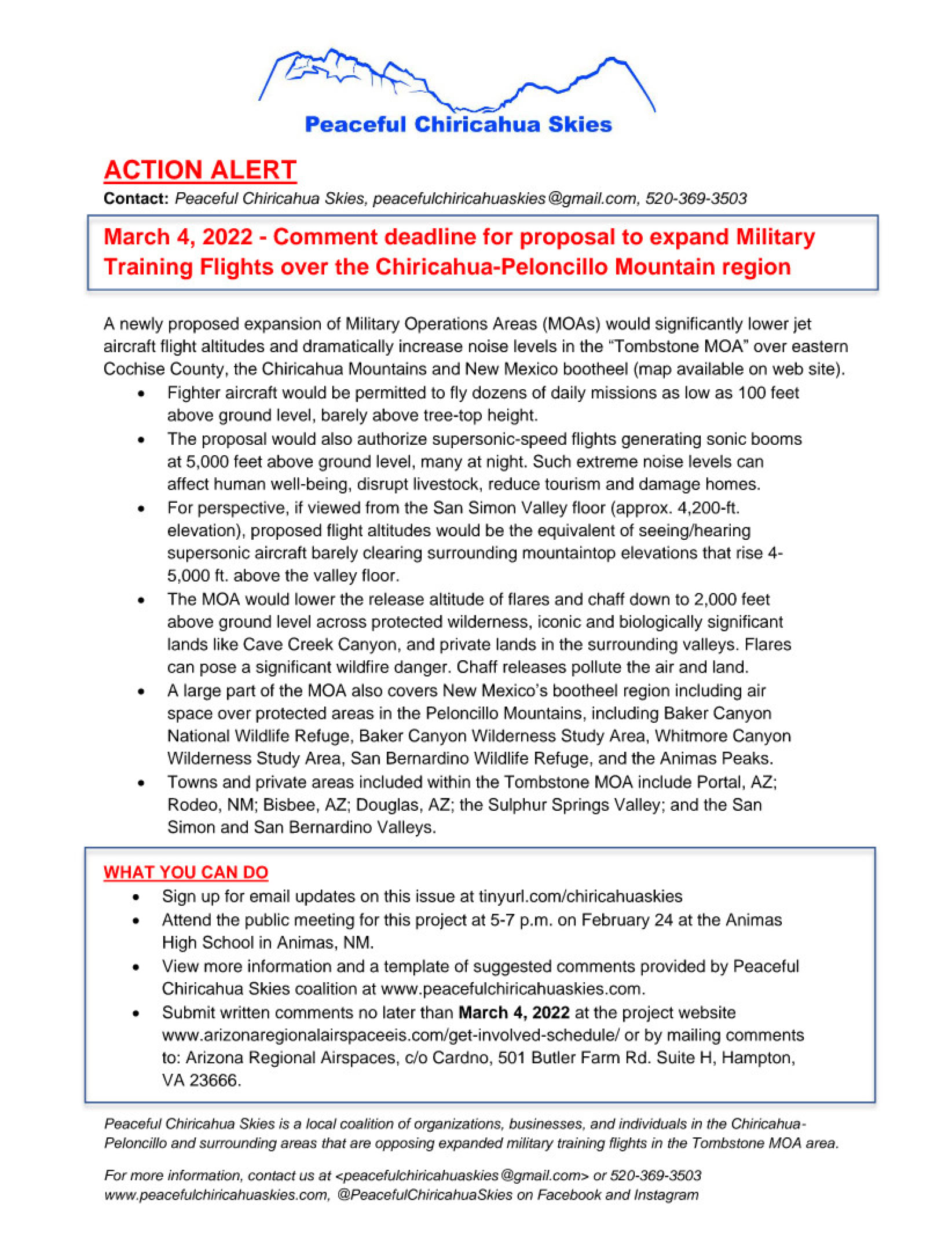 "Peaceful Chiricahua Skies is a local coalition of organizations, businesses, and individuals in the Chiricahua-Peloncillo and surrounding areas that are opposing expanded military training flights in the Tombstone MOA area.